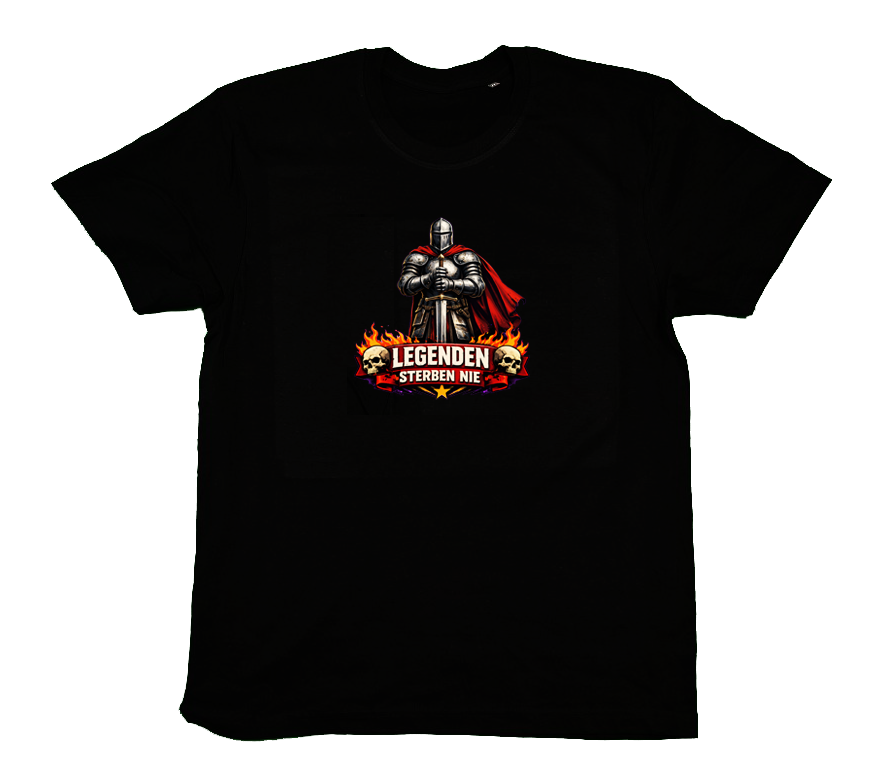 „Helden leben lange, doch Legenden sterben nie“ – wer dieses Zitat aus dem Song „Lasst es uns tun“ nicht kennt, hat etwas verpasst… Mit diesem Motiv huldigen wir das Schaffen unserer Lieblingsband… Zudem haben wir uns den biblischen Ausdruck „das Wort ist das Schwert“ (Hebräer 4,12) zu eigen gemacht, daher dazu der Ritter in gepanzerter Rüstung mit Schwert, dem nichts und niemand etwas anhaben kann…